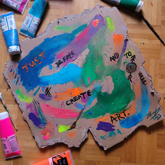 I usually answer that I paint on cardboard because I love the liveliness of its texture and that I enjoy working with strong, vibrant colors. What emerges each time develops organically, inspired by my life and my surroundings.